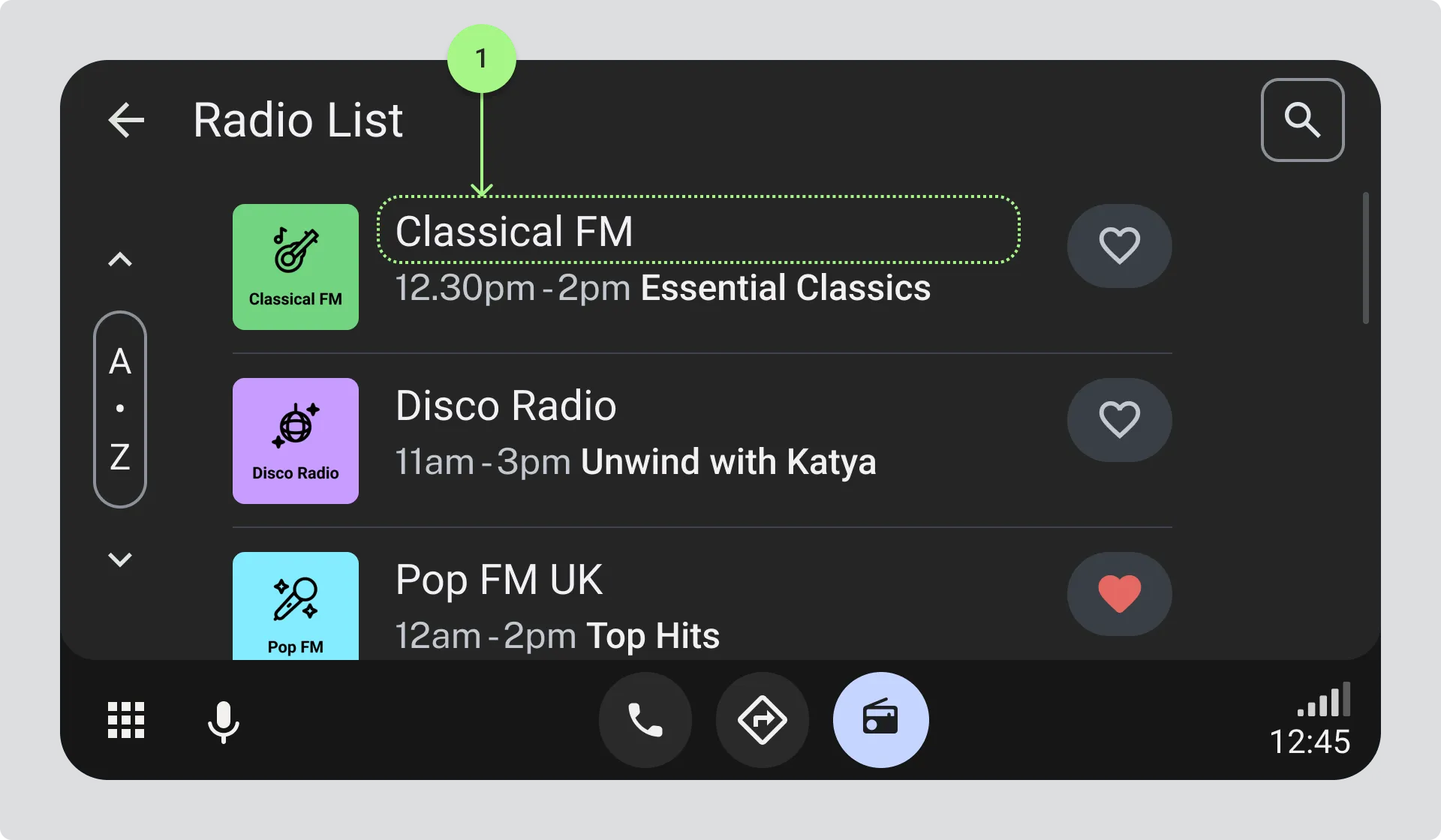 In lists of available stations when drivers are choosing what to listen to