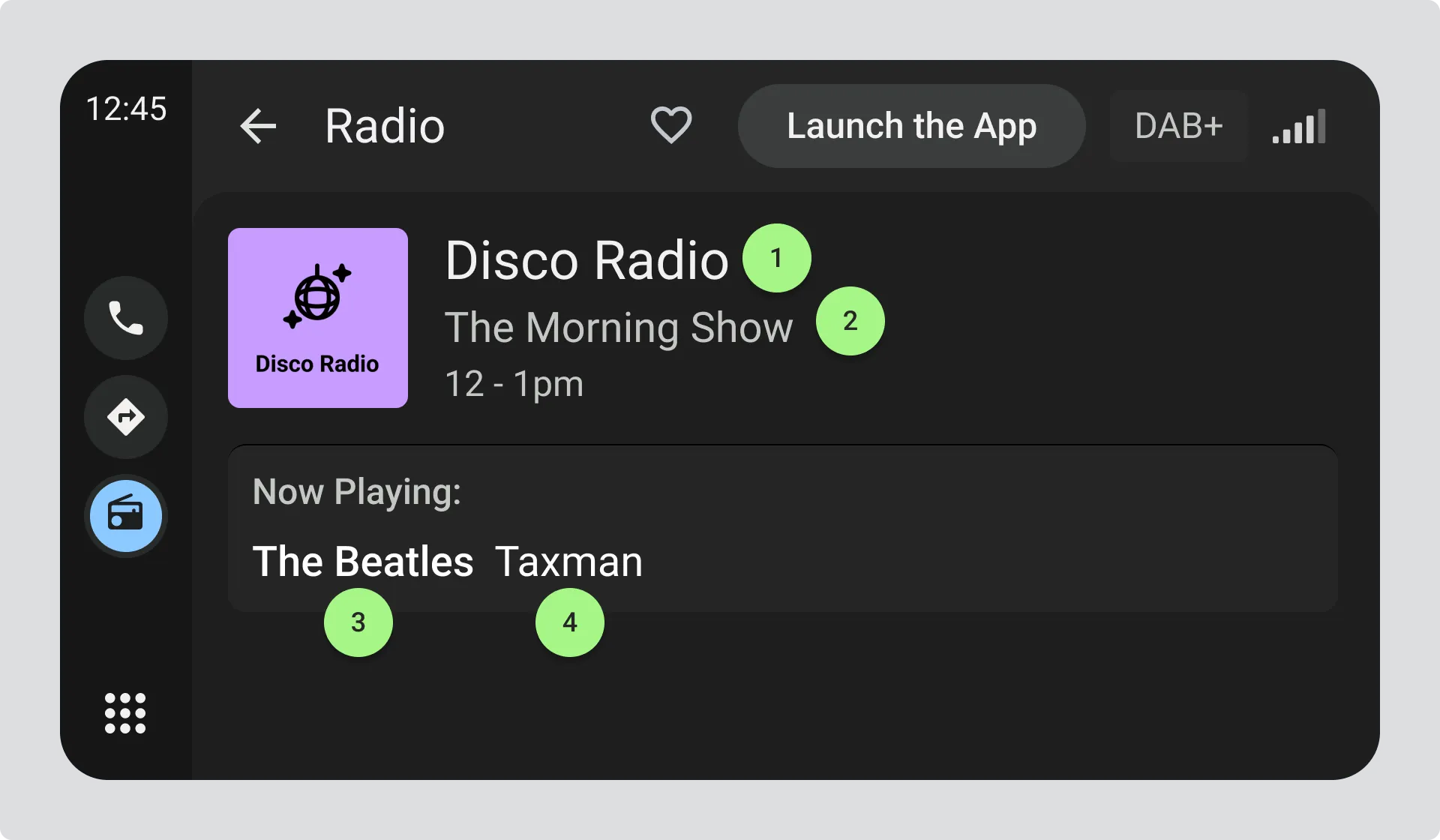 - Is as relevant as possible to what’s being heard, like the current song title and artist, or the current programme name