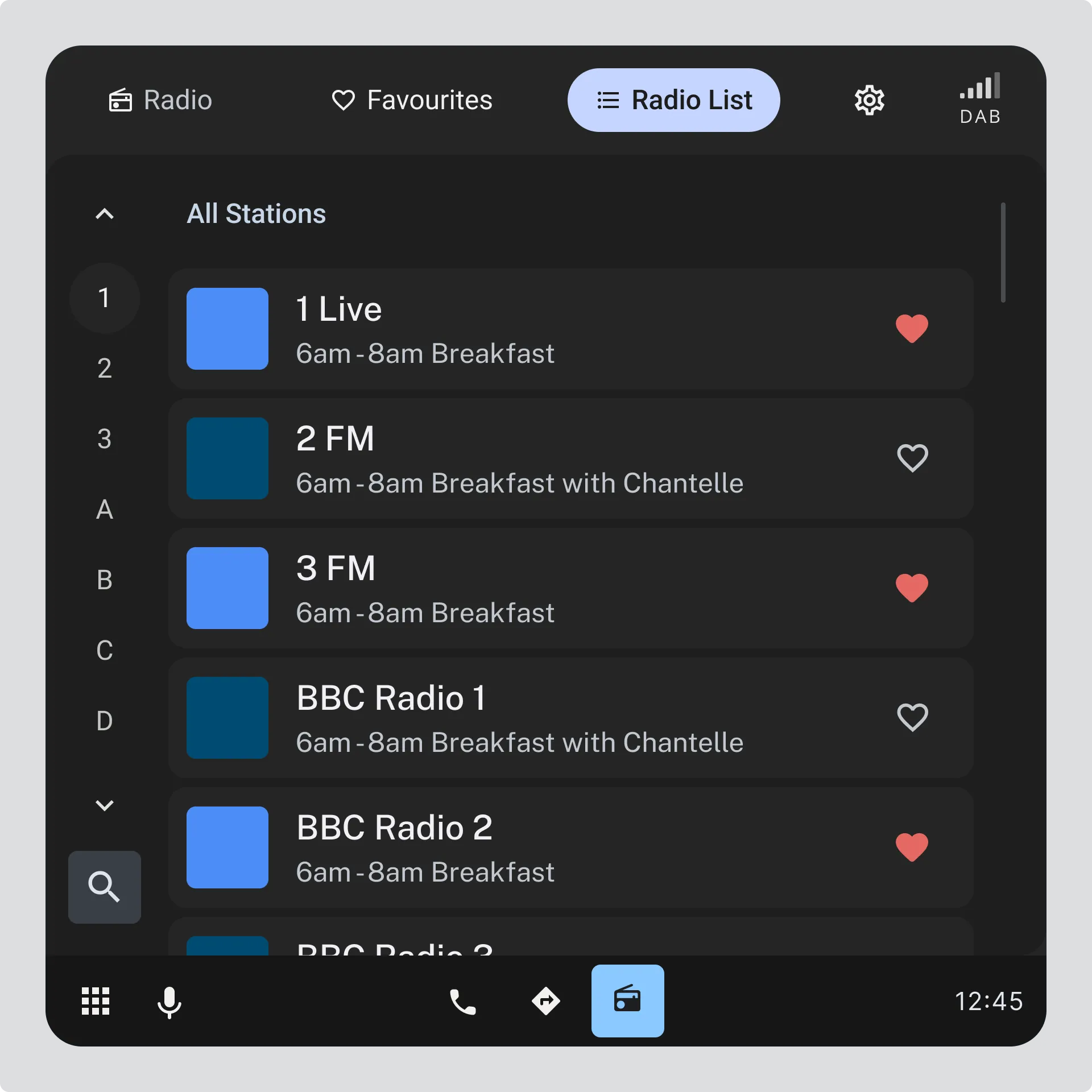Users should be able to filter the station list to show only their favourite stations. This reduces scrolling, simplifies navigation, and makes it easier to select stations while driving.
