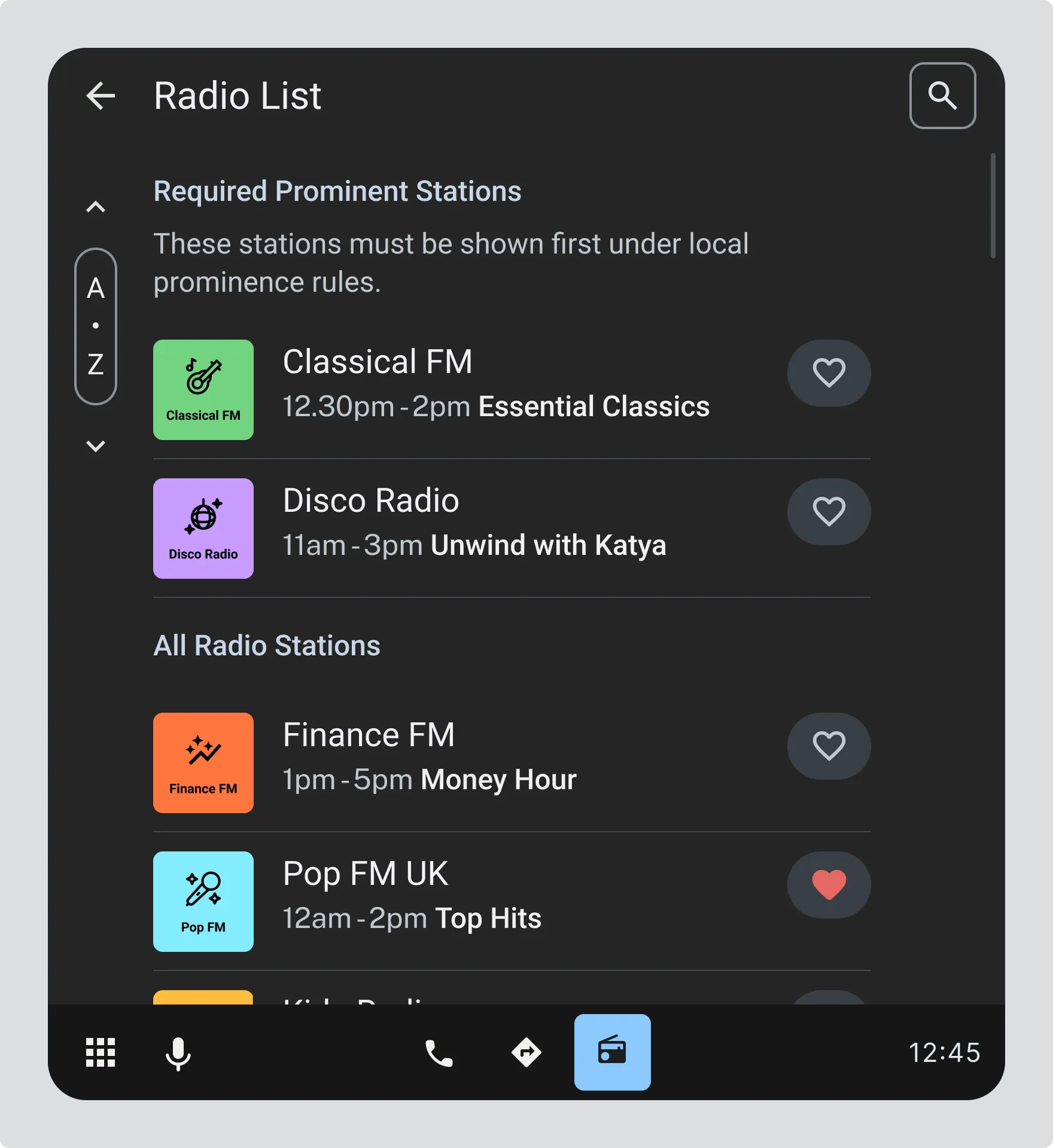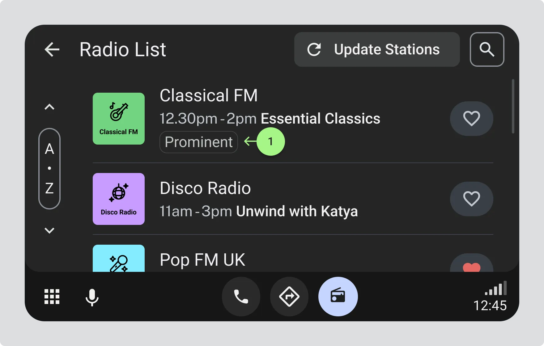 Section titled “Balancing regulatory requirements with driver experience”Some countries require certain radio stations to be displayed in a particular order or given specific prominence over other services. As a manufacturer, you can choose how to achieve that prominence while meeting local regulations. The key is making it clear to drivers which stations have regulatory priority without disrupting the overall experience.