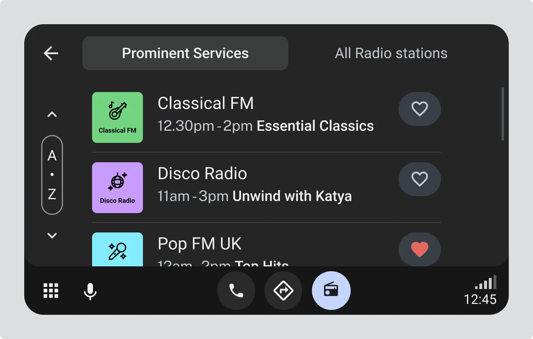 Section titled “Add a filter for prominent services”Provide a toggle or filter button that switches between “Prominent Services” and “All Radio stations”. This lets drivers choose their view while ensuring prominent stations are easily accessible. Use locally suggested wording and iconography for the button.
