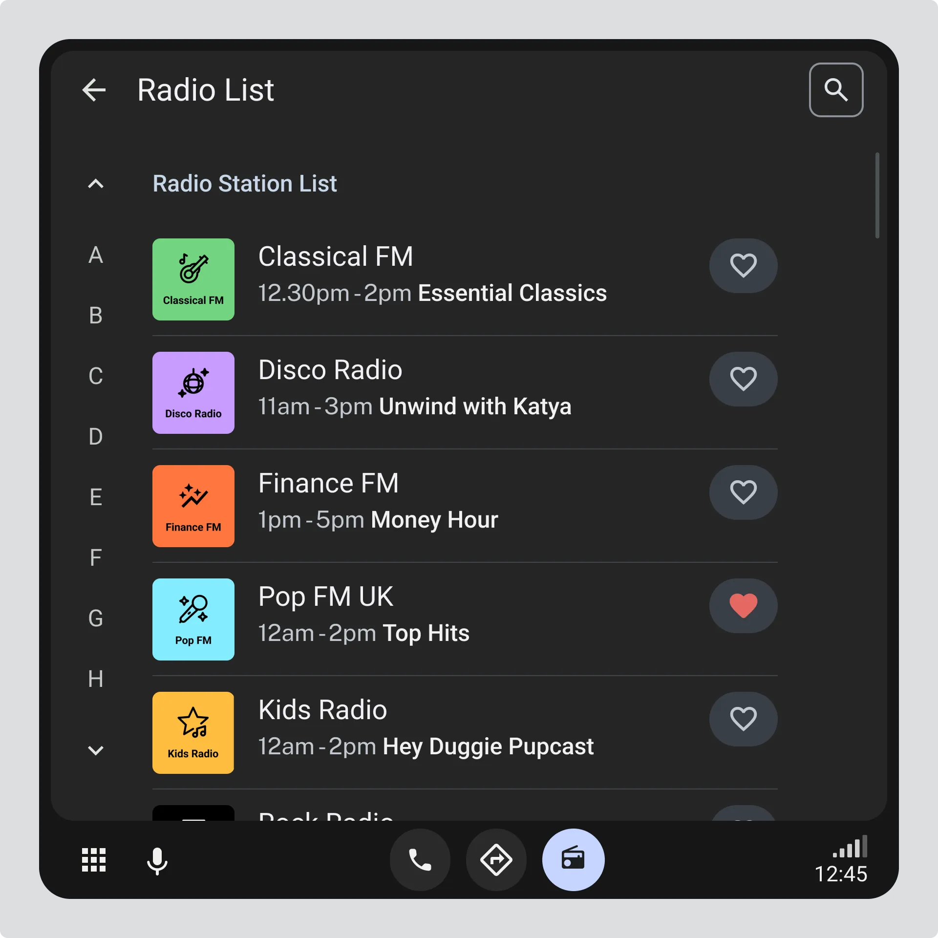 Section titled “Station List Types”Station lists are how drivers find and choose radio stations. As these lists get longer, it becomes harder to scroll, browse, and recognise what’s available.
