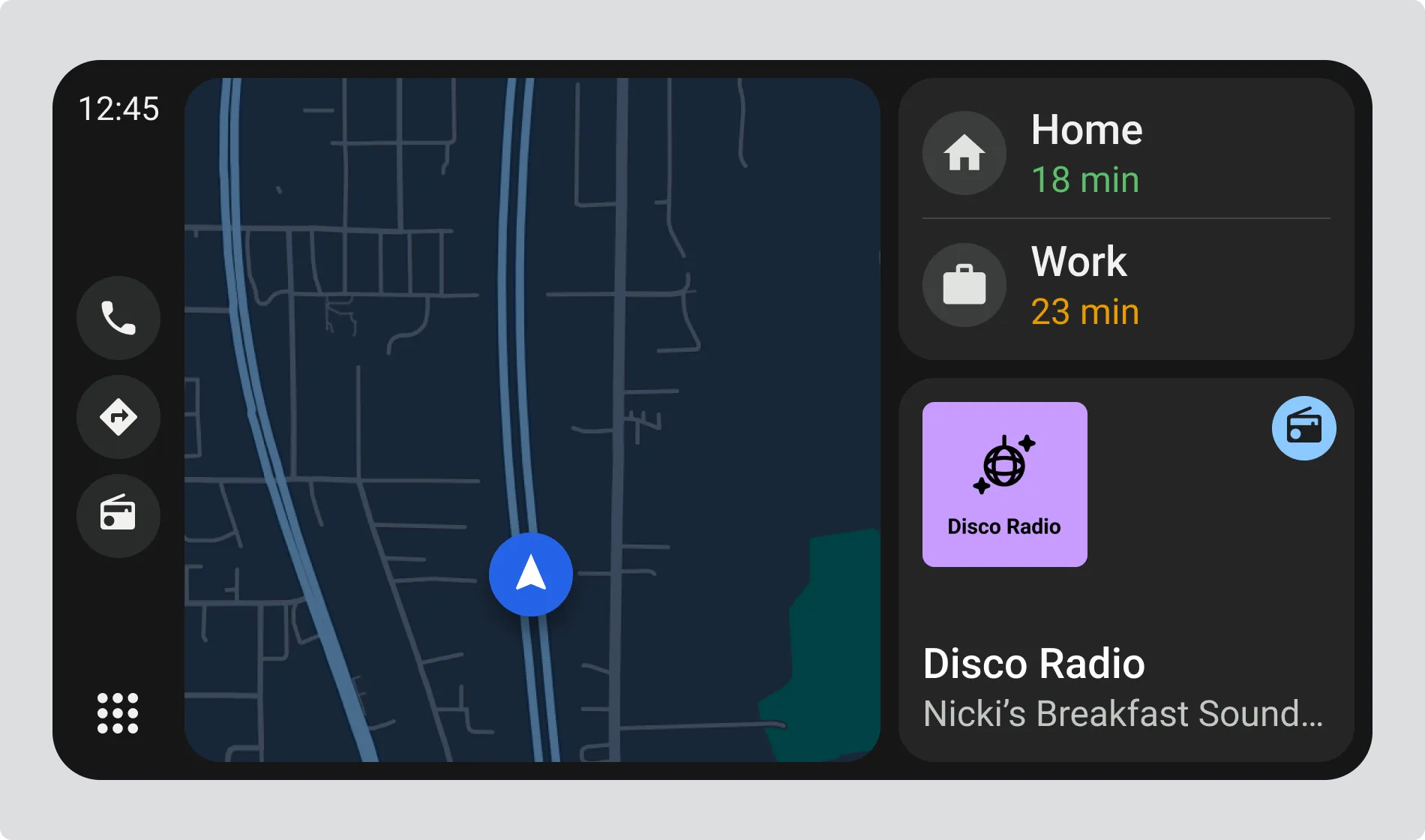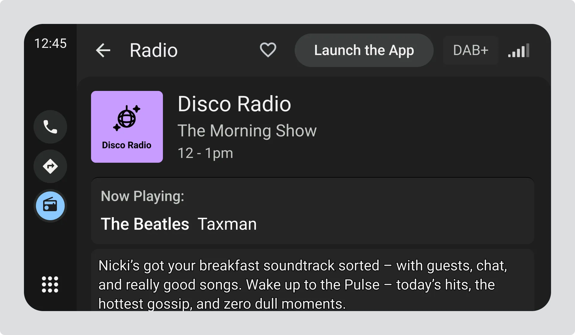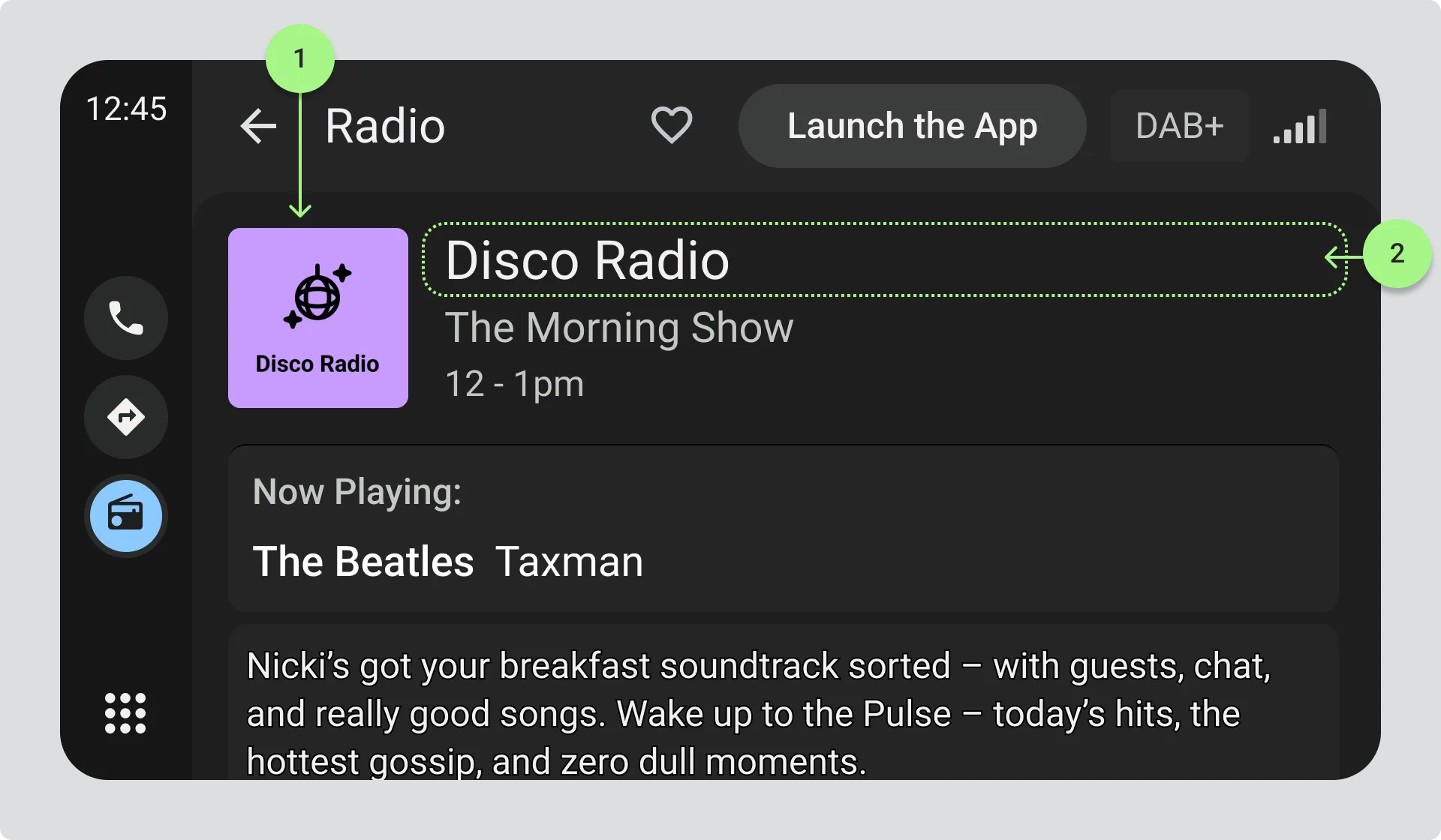 The Station Information view gives drivers the key details about the station they’re currently listening to. It should always be the main view when audio is playing because it helps drivers quickly recognise: