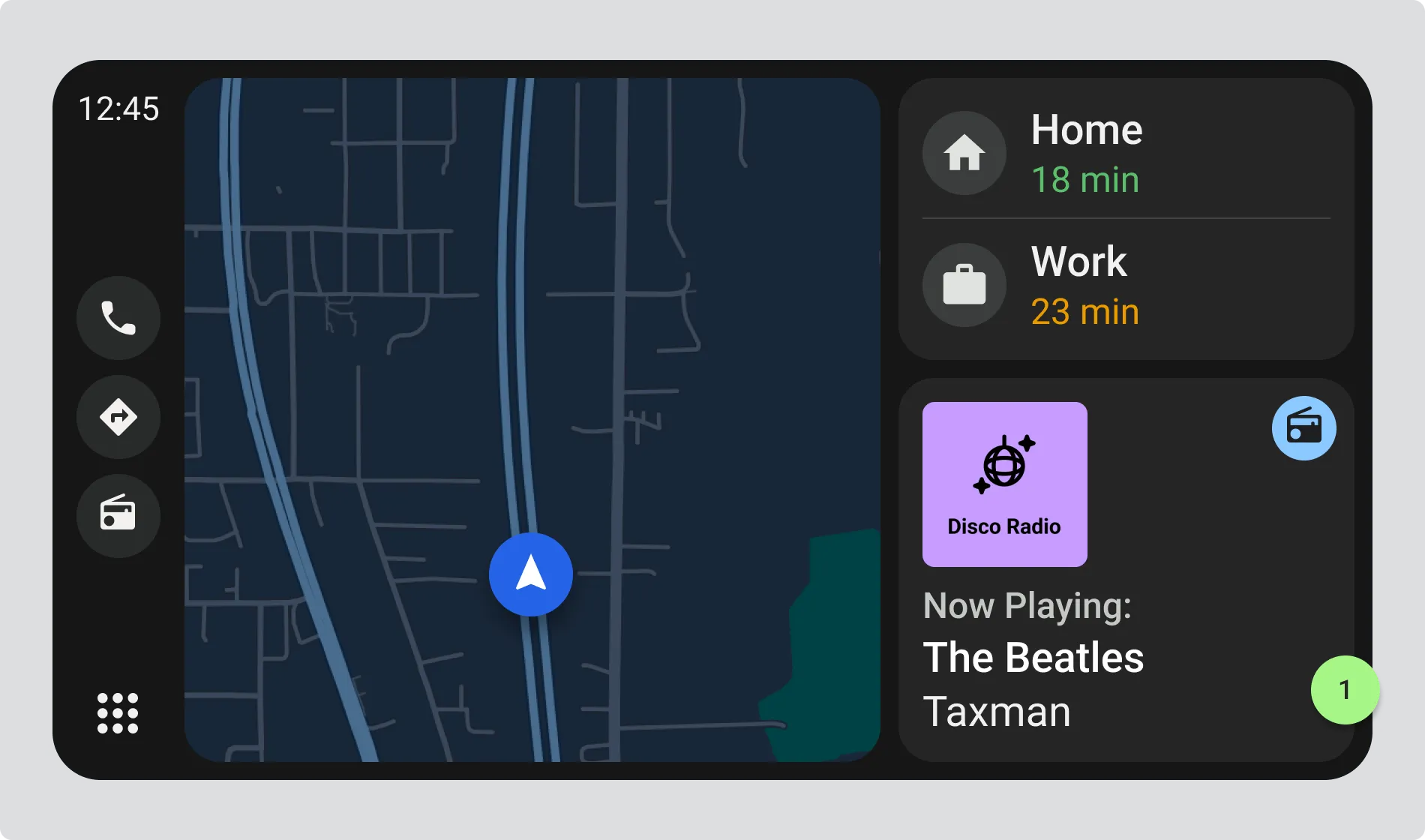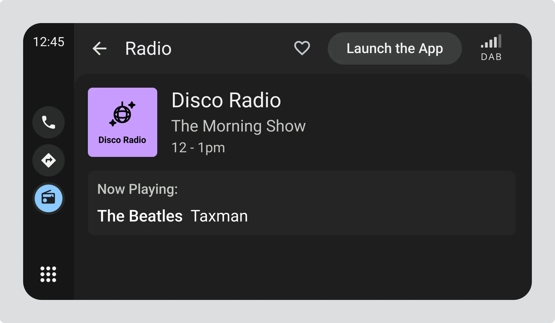The example shows a mini-view of the display, where only the Programme Name and Title are shown while the driver may be using other apps such as navigation.