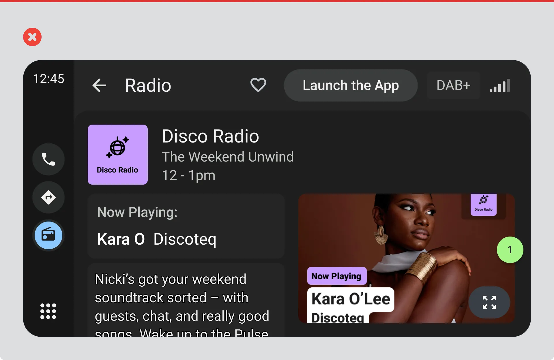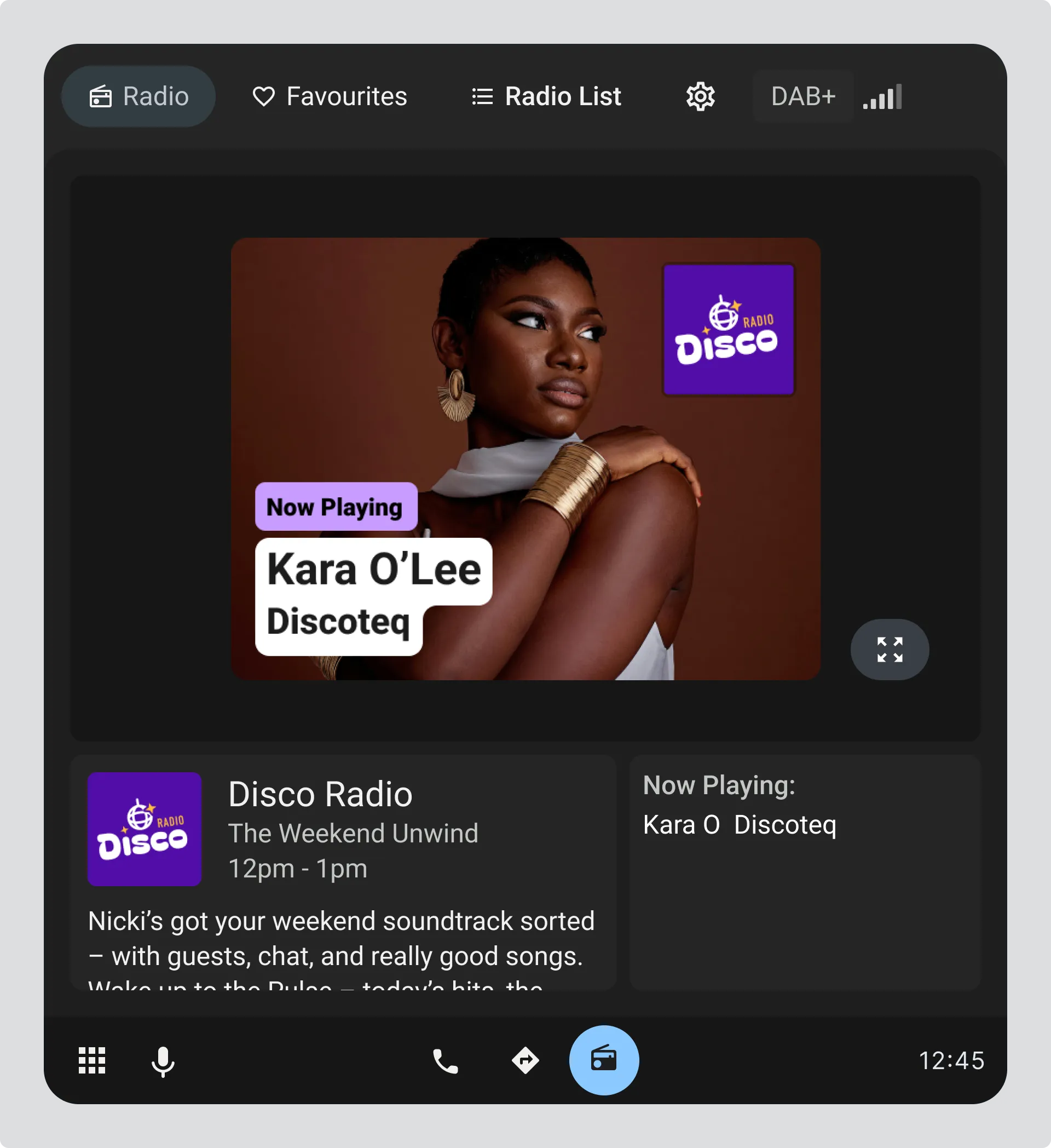 - Expanded view shows the full image with a clear back option to return the driver to the radio home screen.