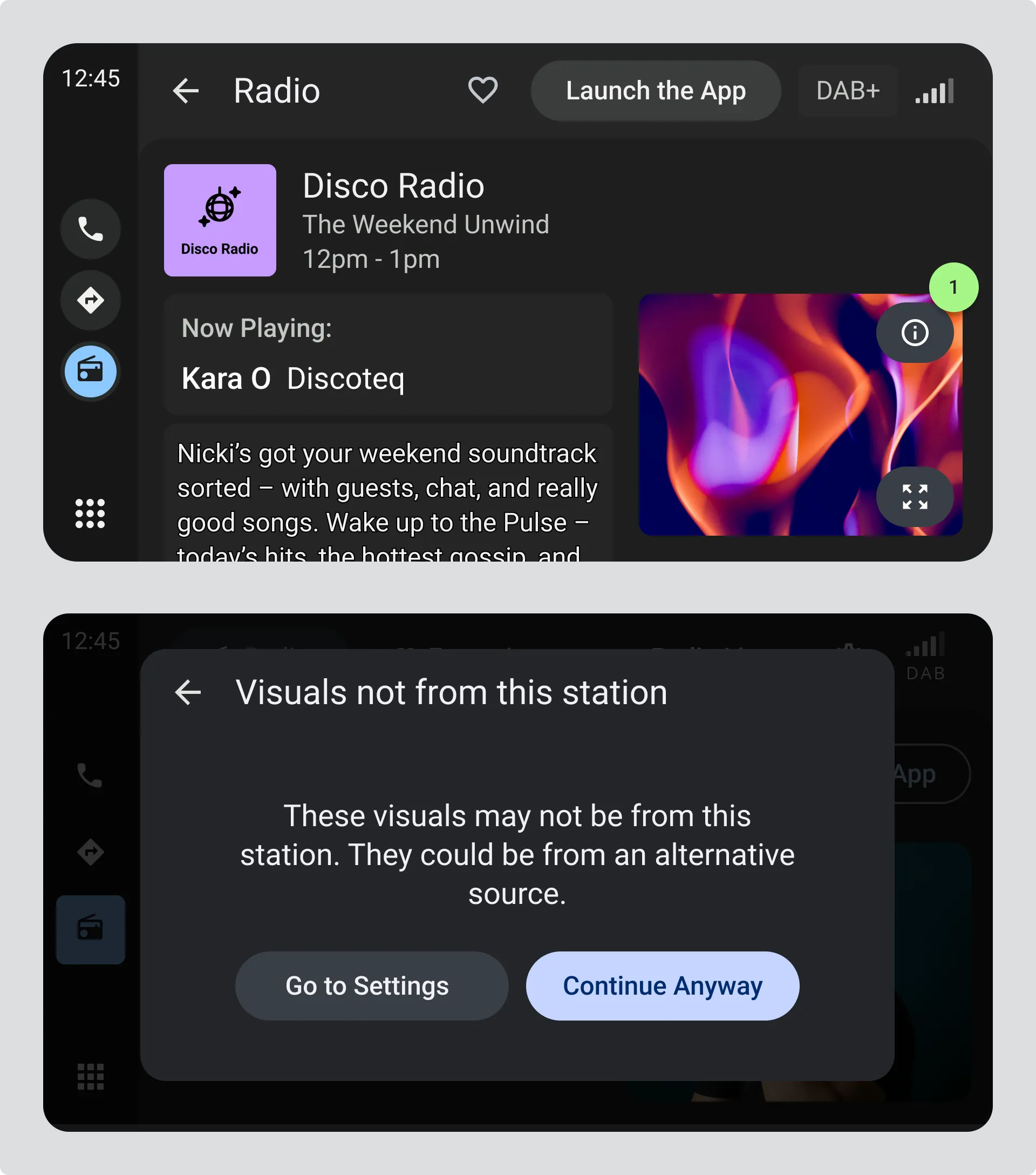 Provide a setting that lets drivers disable alternative visuals or choose to always prioritise station-provided visuals. And never let drivers think alternative visuals are coming from the radio station. Make it clear that the visuals aren’t station-provided, for example through a different attribution label or an icon that opens a dialog explaining the source.