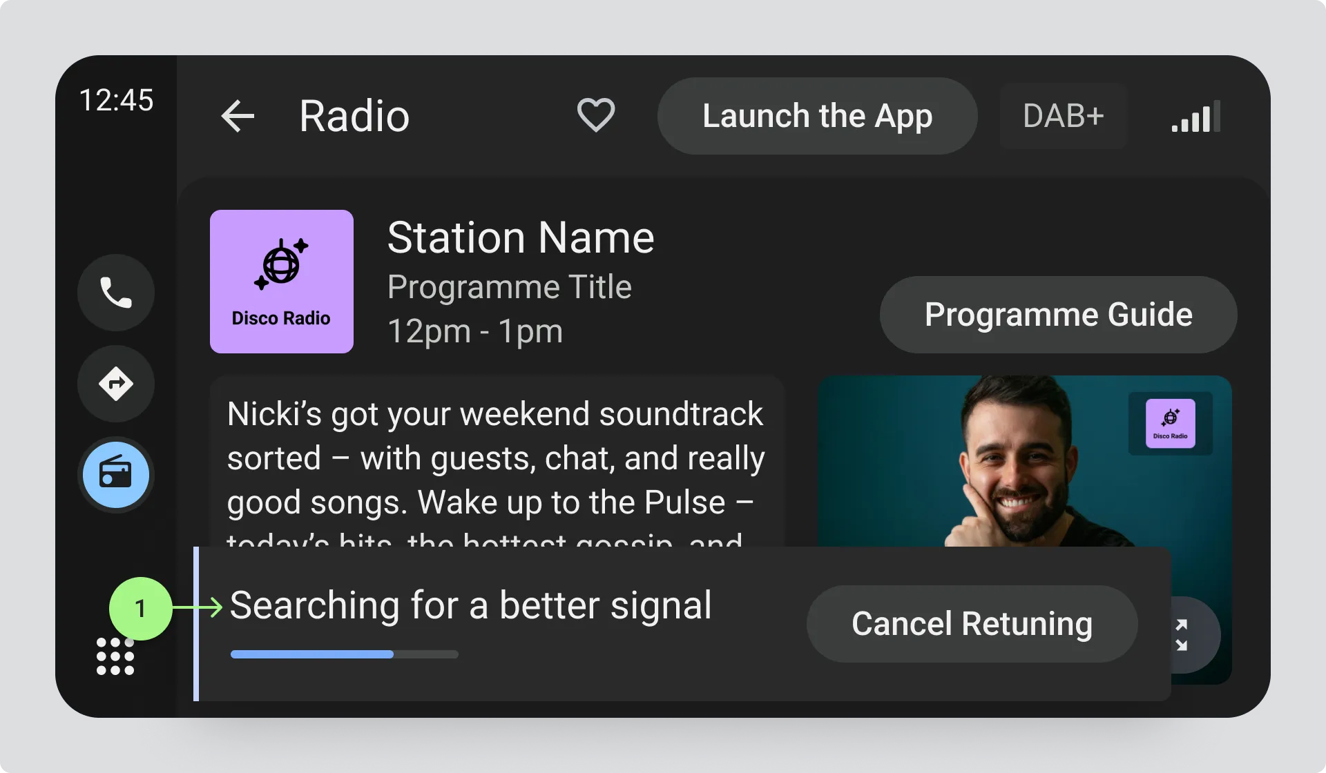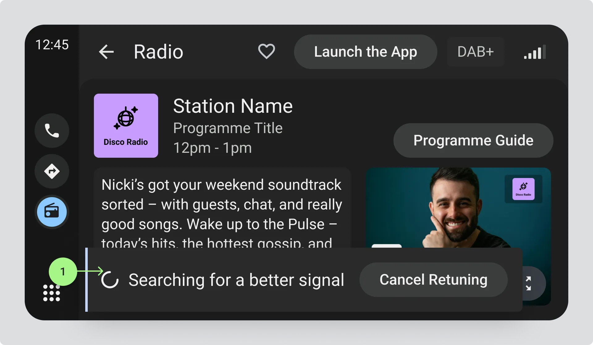 Section titled “Successful retuning”If retuning is successful, update the station information as if the driver had selected the new station from the station list. This includes the station name, logo, and all associated content and metadata. You may need to wait for new text and visual information to come through before the display is fully updated.