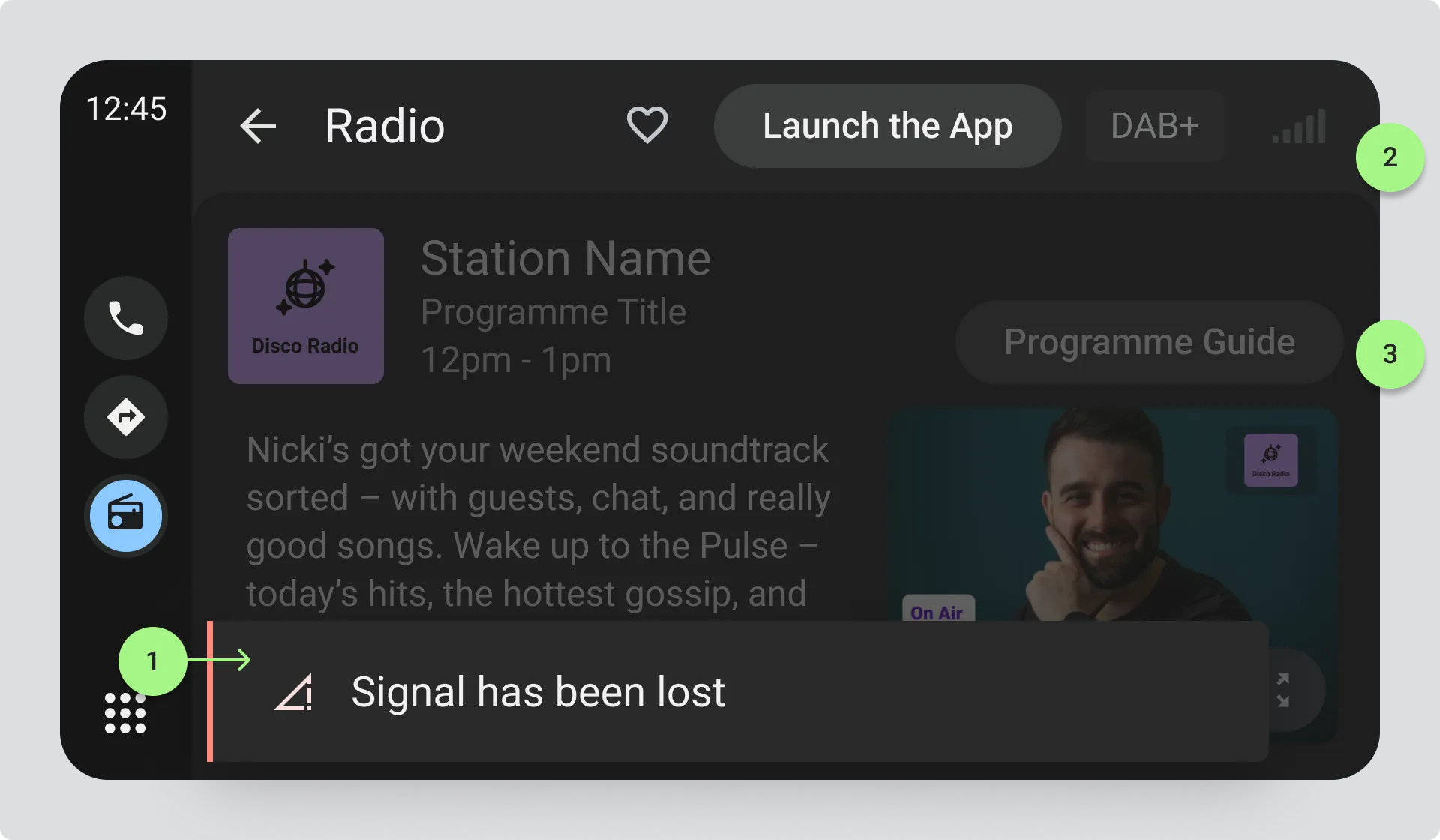Section titled “Unsuccessful retuning”If no alternative signal can be found, use the Signal Loss state to let the driver know that the current station is unavailable.