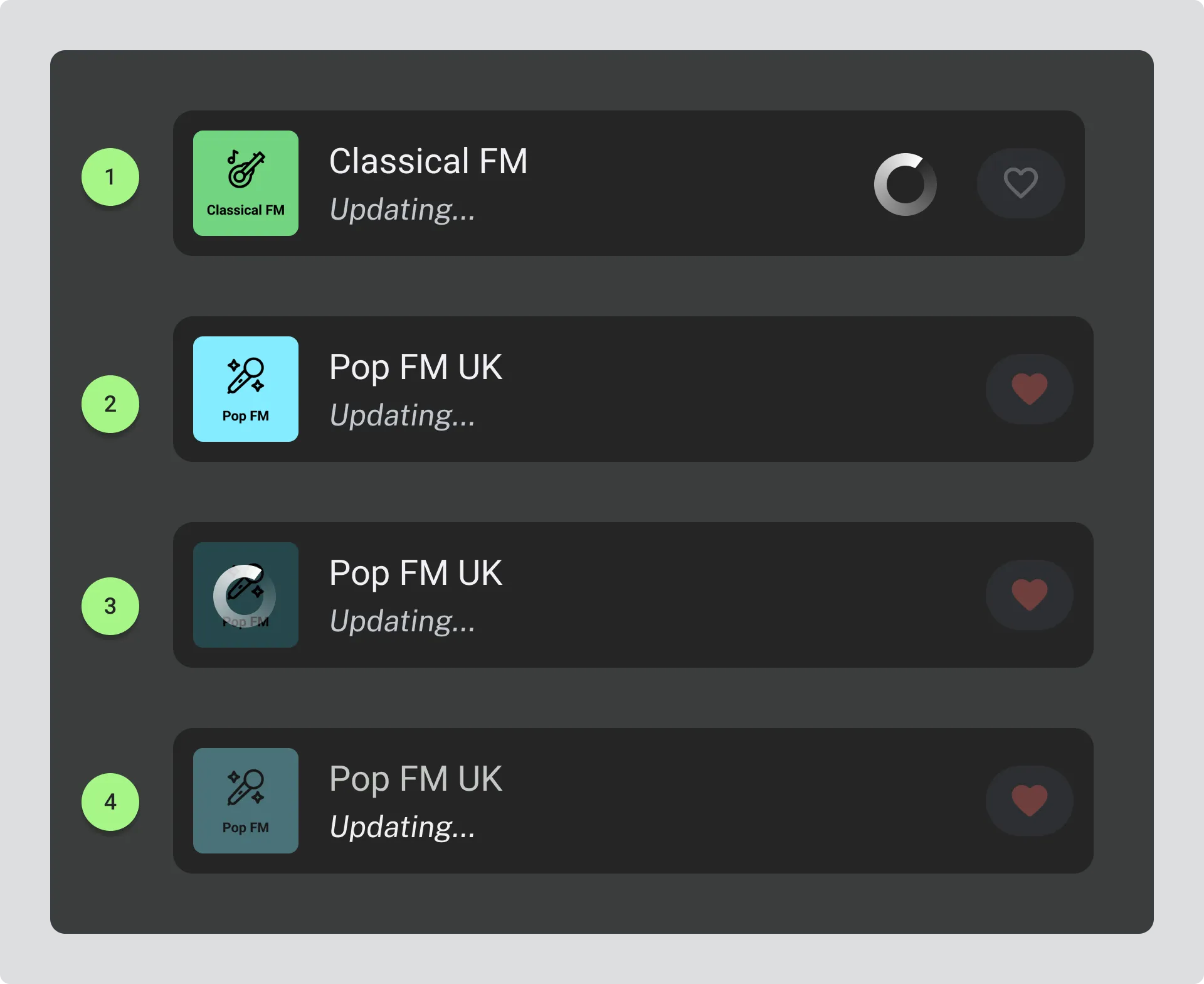 - Animated icon overlays the station logo and indicates that the item is being updated.
