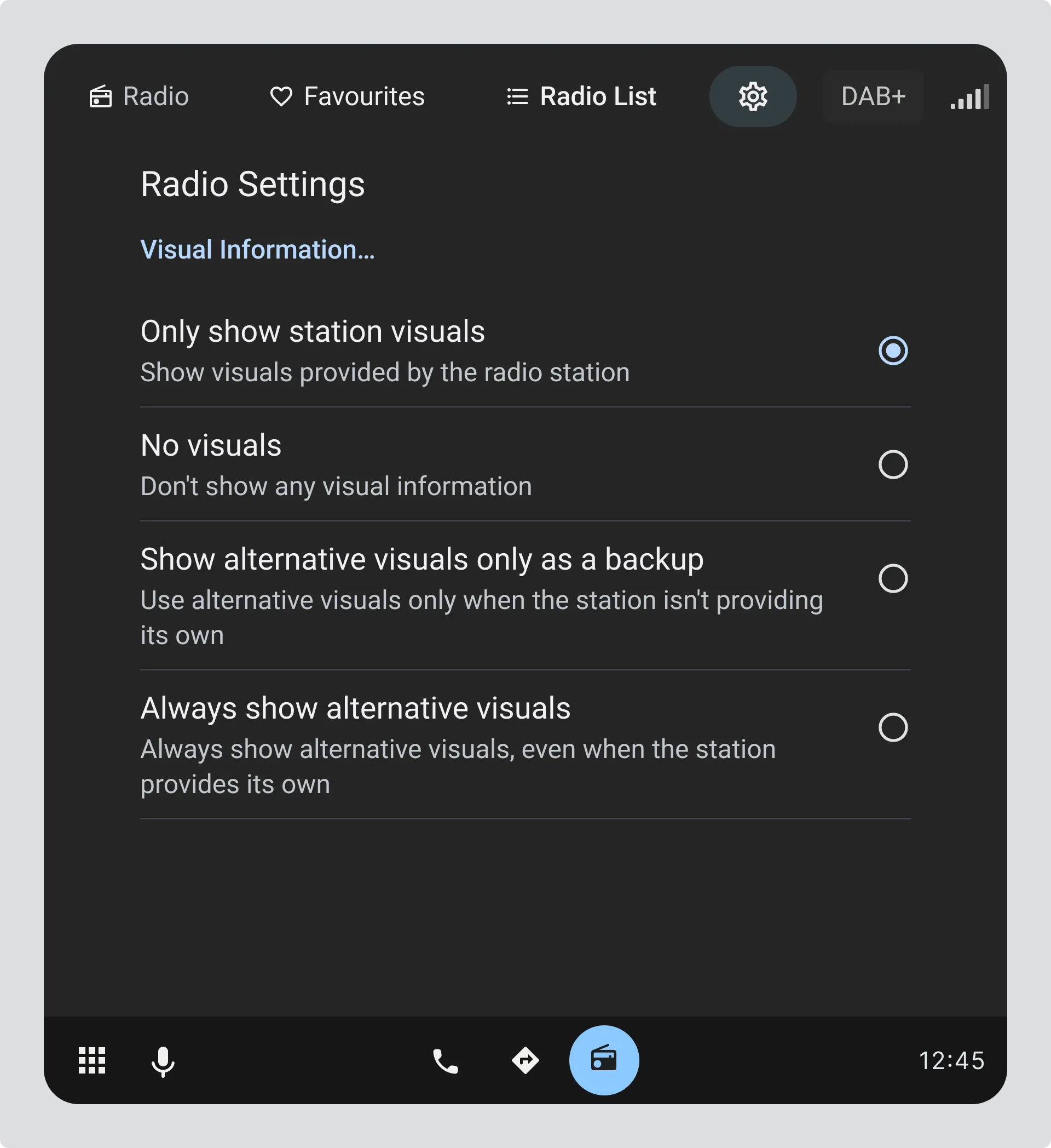Radio Settings screen with four clearly labelled options under Visual Information. Station visuals only is selected by default, ensuring drivers always see visuals from the radio station when available.